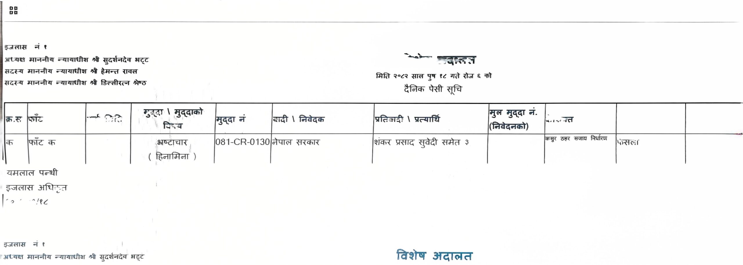पुस ६ गते उक्त मुद्दामा विशेष अदालतका न्यायाधीश सुदर्शनदेव भट्ट, हेमन्त रावल र डिल्लीरत्न श्रेष्ठको संयुक्त इजलासले अस्पतालमा दुई शीर्षकमा २५ लाखभन्दा बढी रुपैयाँ हिनामिना भएको ठहर गरेको थियो । उनीहरुले बीमितहरूको नाम दर्ता गर्ने कार्य गर्दै आइरहेकोमा निजले अनधिकृत रूपमा बिलिङ काउन्टरमा प्रवेश गरी बिलिङ गर्ने गरेको र बिलिङबाट प्राप्त रकम बैंक दाखिला नगरी हिनामिना गरेको भनी परेको उजुरीका आधारमा अख्तियारले अनुसन्धान थालेको थियो ।